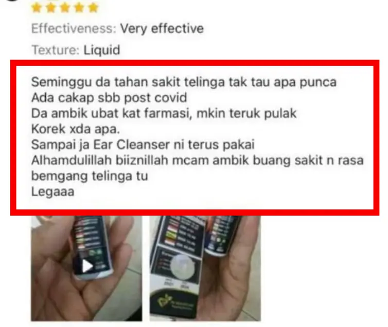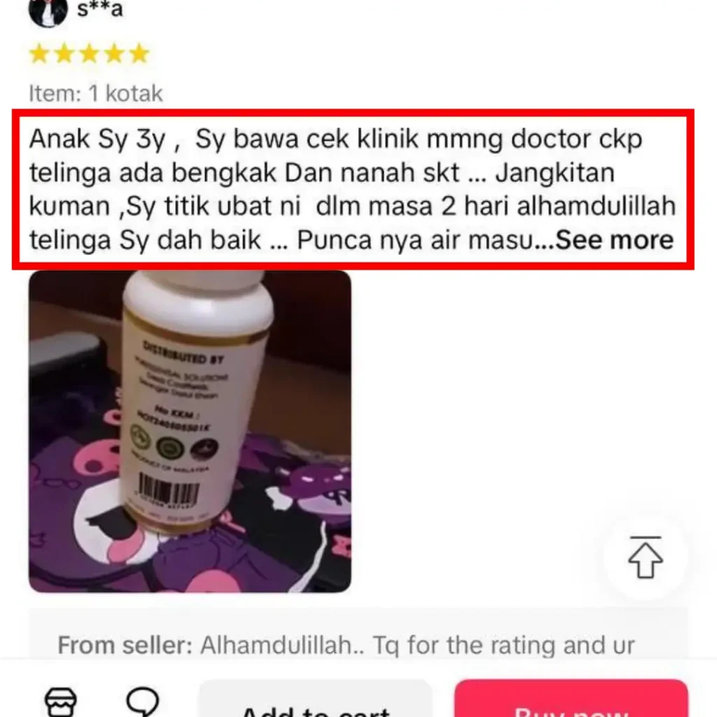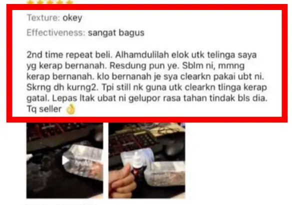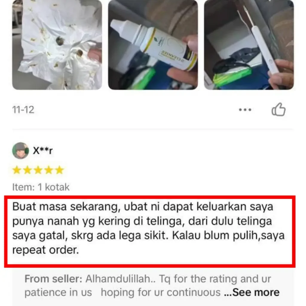 “Telinga saya kerap bernanah. Lepas titik ubat ni, kurang sangat. Gatal pun hilang.”